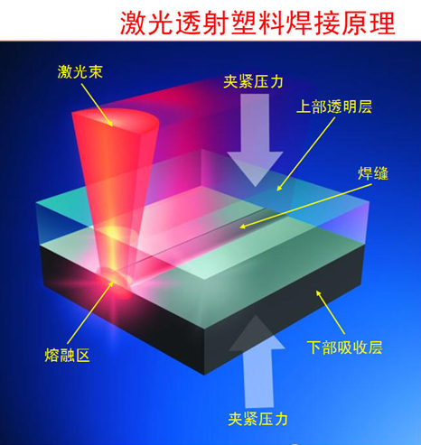 利用激光把上下兩層塑料部件焊接,首先把部件夾緊在一起,然后以近紅外線激光NIR(波長810-1064nm),透射過上層部件,然后被下層部件的近紅外線激光轉化為熱能,將兩個部件的接觸表面融化,由于上下兩層材料有很好的熱傳導性并且接觸很緊密,下層產生的熱量可以穿到上層材料并使之融化,這樣就將上下兩個部件熔焊接在一起,形成焊接區。焊接縫強度超過原材料強度。