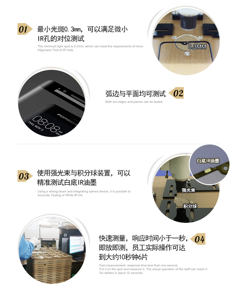 適用于不同尺寸電容屏光學感光IR油墨、AR 鍍膜玻璃、白玻CG、TP模組等產品透光率的檢測,尤其適用于IR油墨與ICON(圖標)快速實時多波長透光率測量。