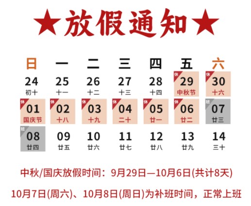 2023中秋、國慶喜相逢。感謝大家對我司的信賴與支持!也祝大家月圓人聚心團圓,人慶家慶舉國慶!