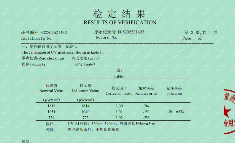 2.核心數(shù)據(jù)表:這部分通常是個(gè)表格,列明了在不同紫外強(qiáng)度標(biāo)準(zhǔn)值下,被檢儀器的顯示值以及計(jì)算出的誤差。